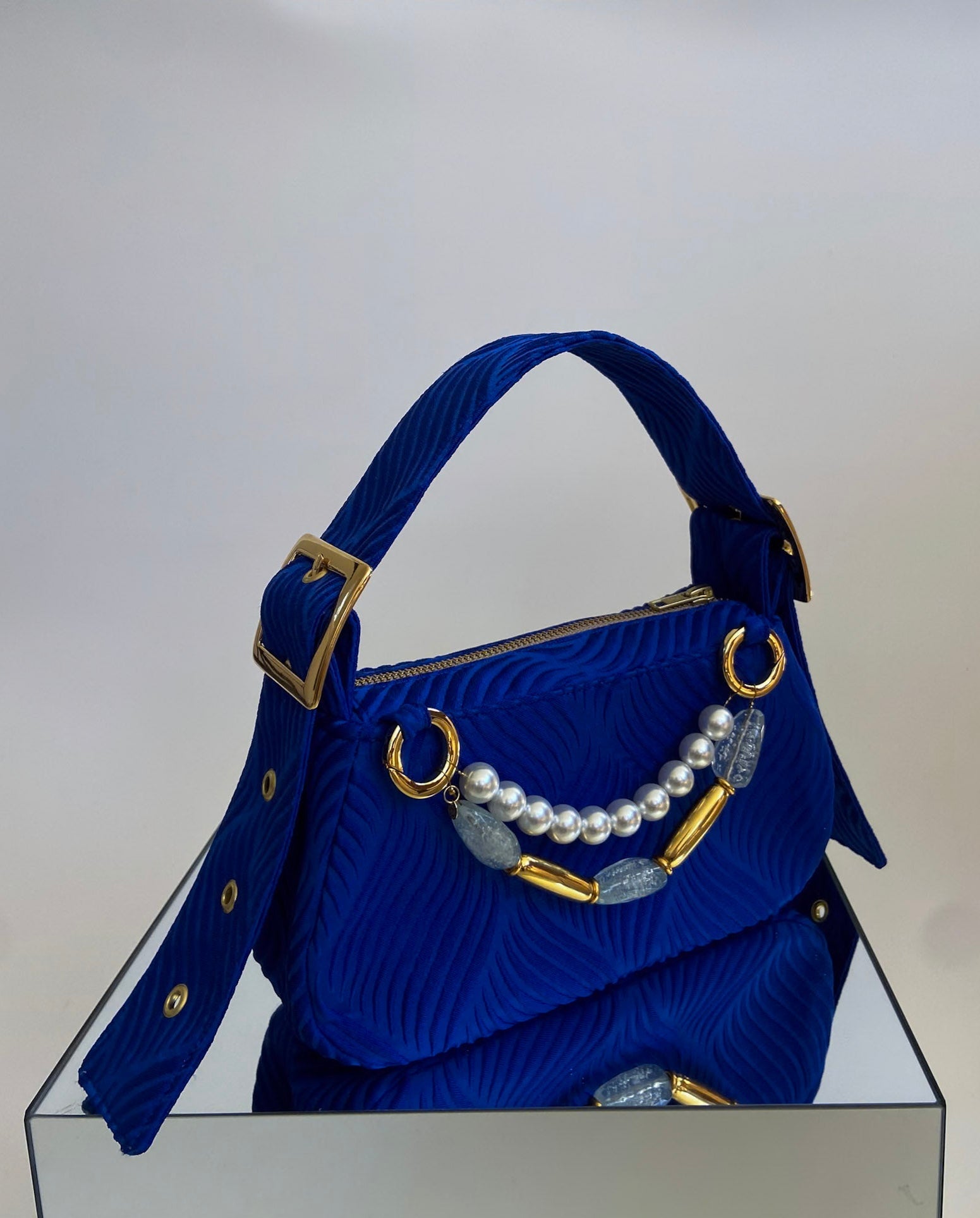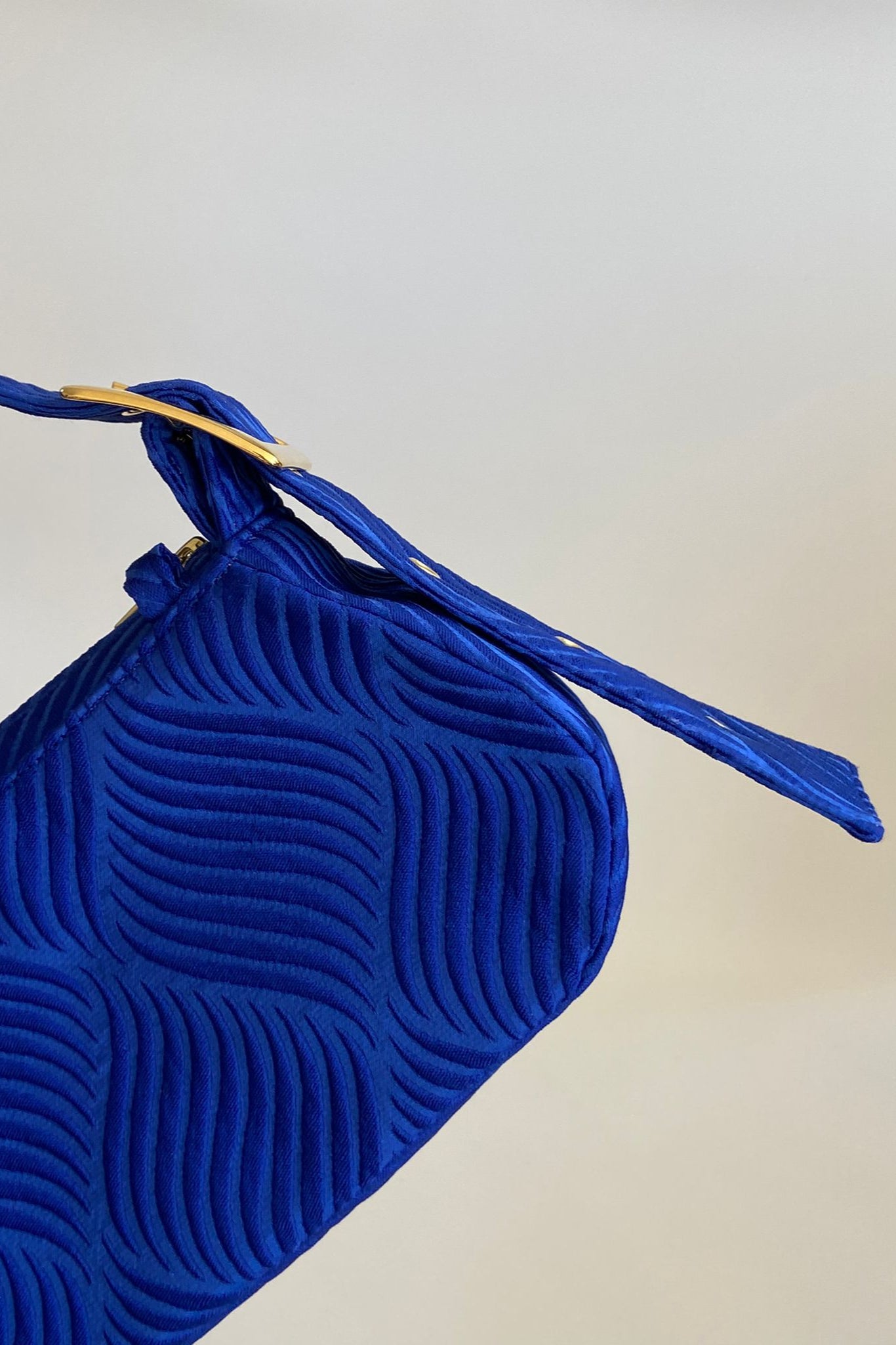 This beautiful bag is crafted from richly textured, cobalt blue colored jacquard fabric from Barcelona and lined with 100% soft cotton.