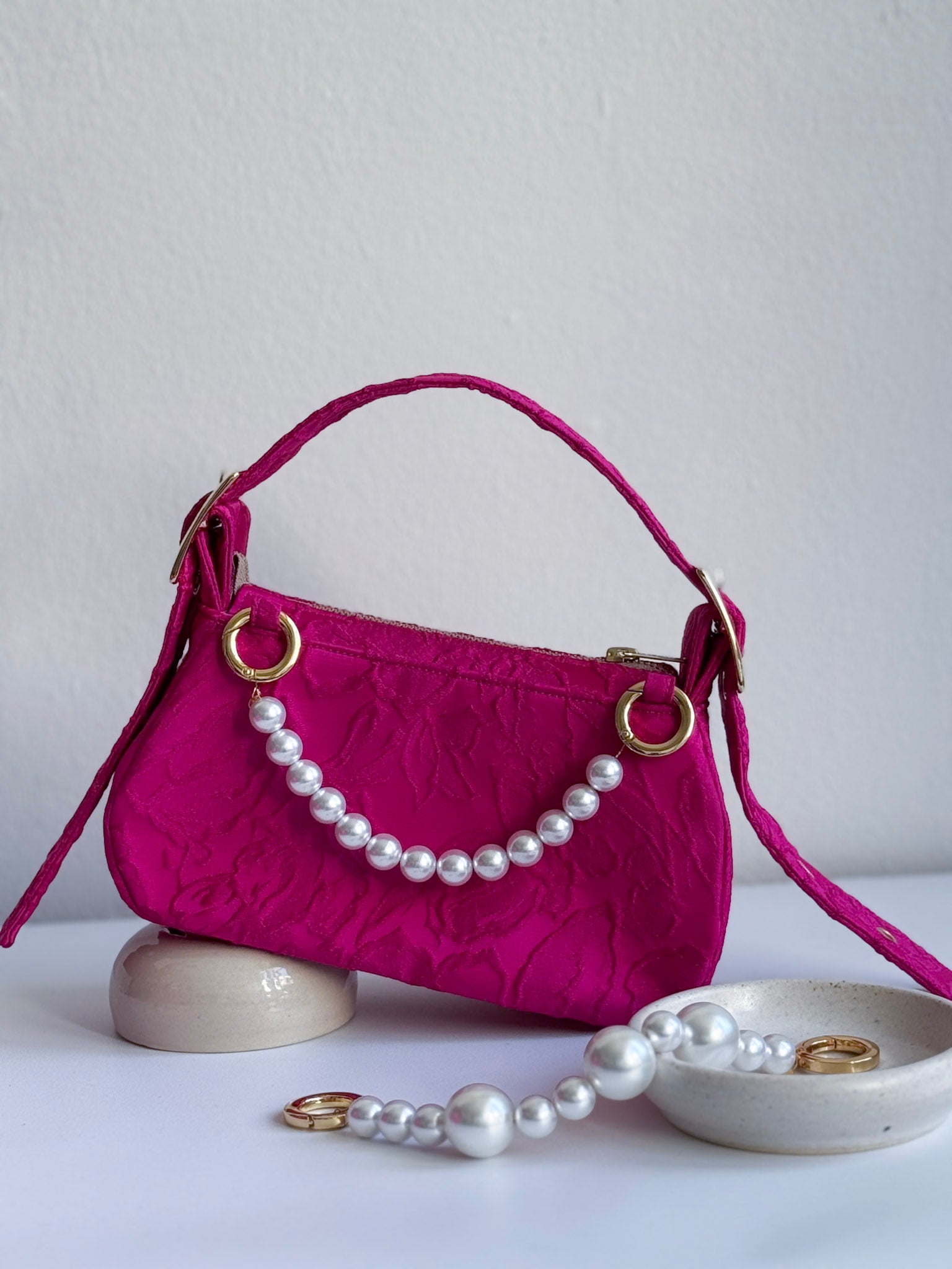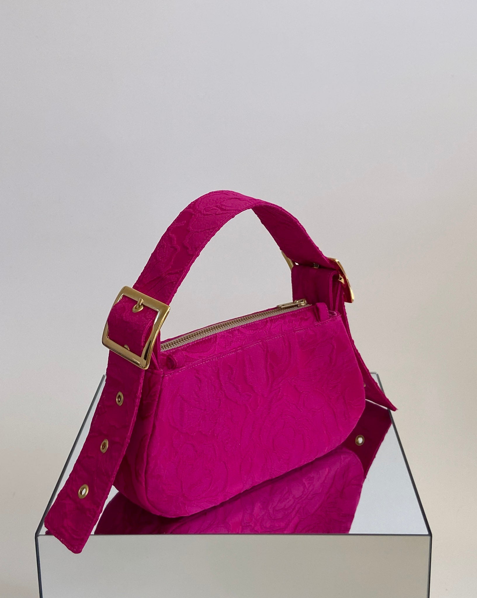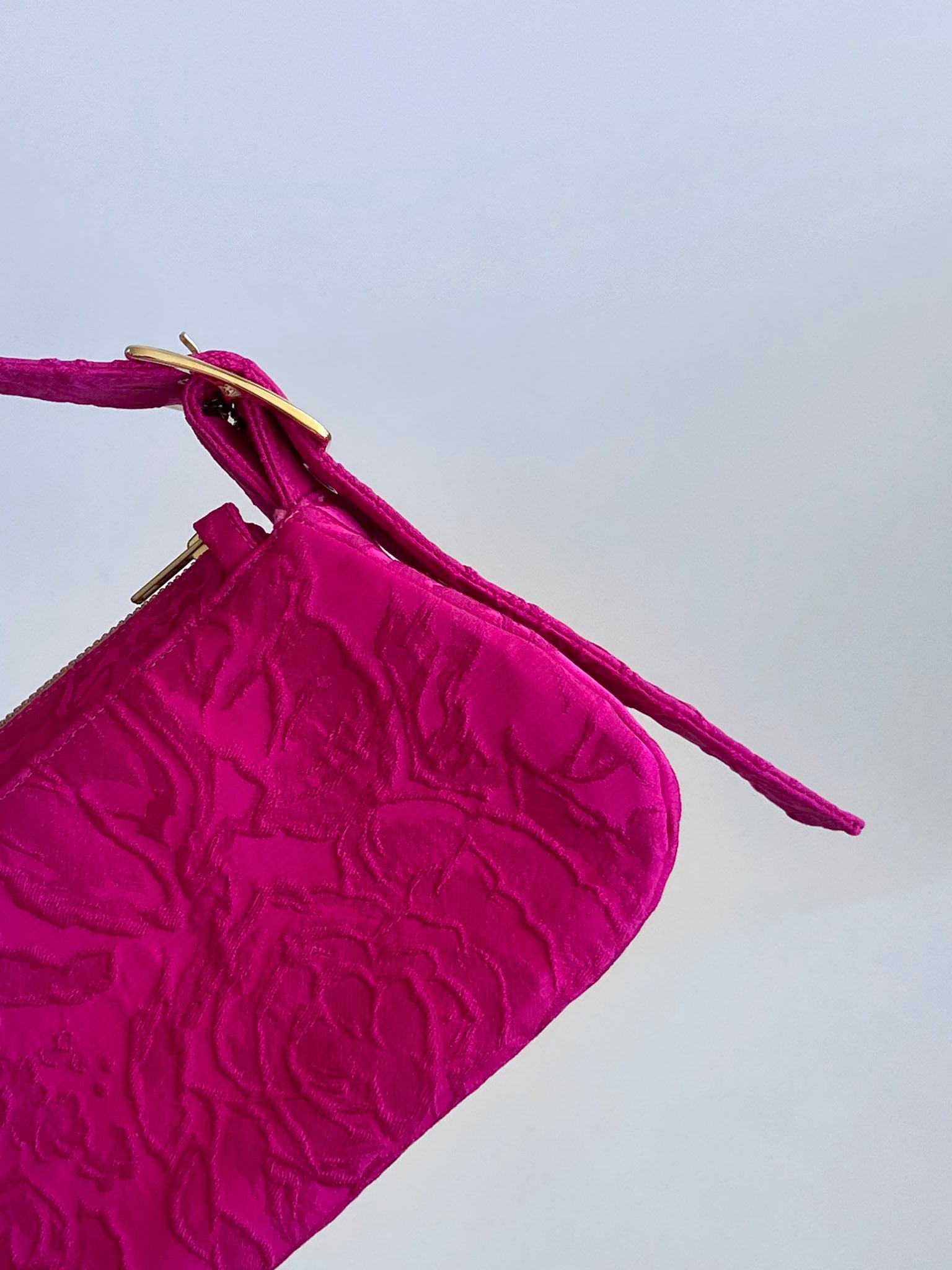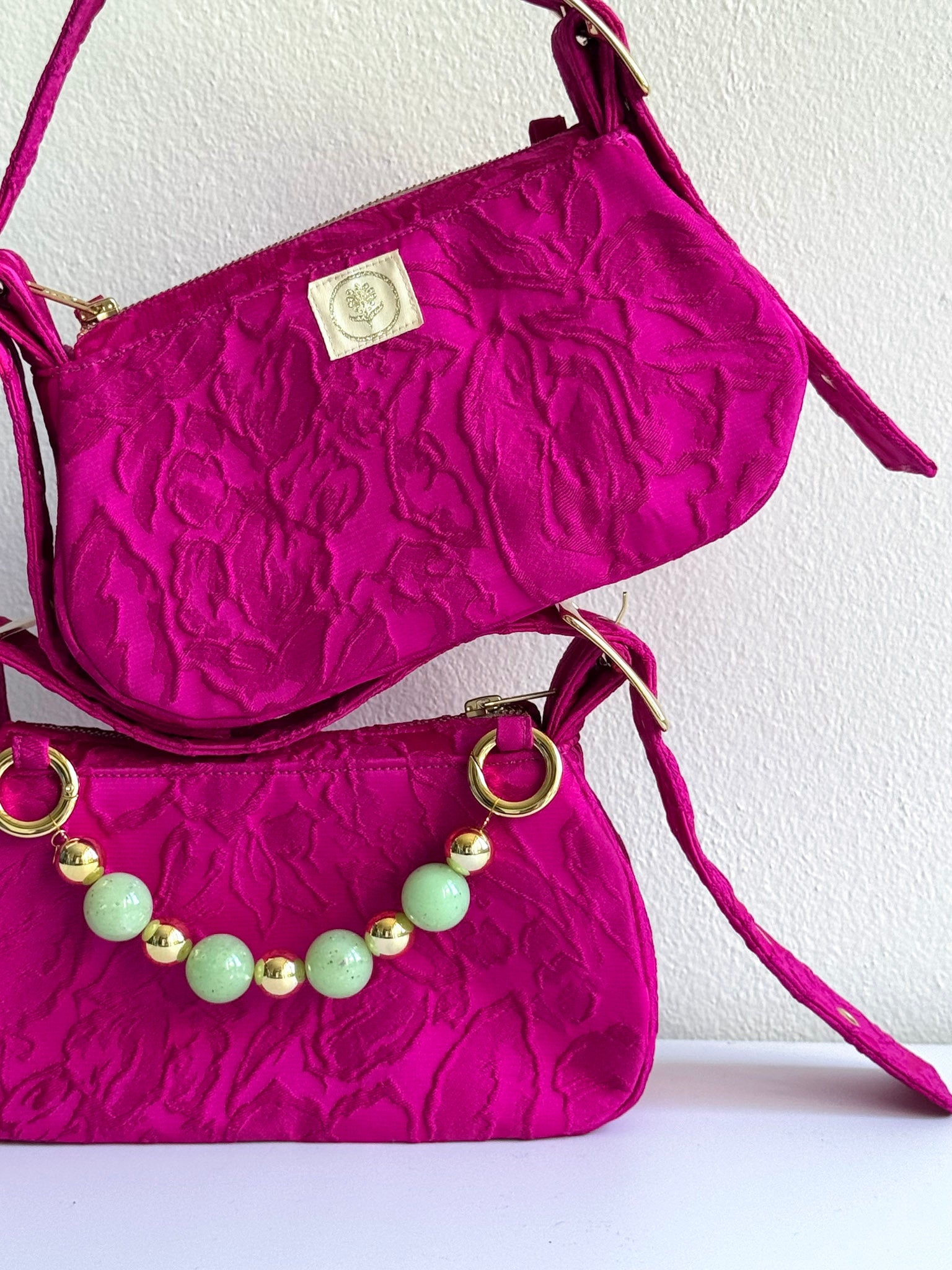 This beautiful bag is crafted from richly textured, fuchsia colored jaquard fabric from Barcelona and lined with 100% soft cotton.